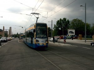 Die 3 Leipziger Niederflurtypen hintereinander, vornean NGT8 1144, gefolgt von Leoliner 1303, hintendran ClassicXXL 1212.