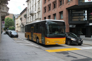 Die Postautos passieren die Haltestelle Centro ohne Halt zum nahegelegenen Autosilo Balestra. Einem Bushof wie man ihn von Fernbussen kennt. Er ist jedoch dunkel und im Keller eines Parkhauses, weshalb es schöner ist, die Postautos bei der Zufahrt zum Autosilo zu fotografieren. |
