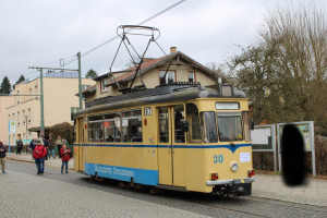 28 steht am Tag der Verabschiedung der Gotha-Wagen am 01.03.2025 an der Woltersdorfer Schleuse zur Abfahrt nach S Rahnsdorf bereit. Personen auf dem Bild wurden durch Photoshop unkenntlich gemacht. |