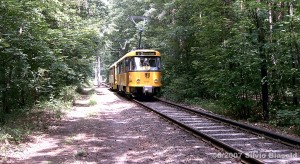 Ein Tatra-Gespann biegt gerade von der Weixdorfer Strecke auf die Hellerauer Strecke ab. |
