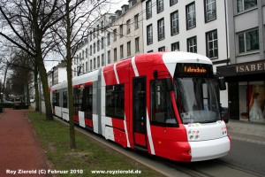 Eine der neuen Straßenbahnen vom Typ Bombardier Flexity Outlook als Fahrschulfahrt auf dem Nordwall in Richtung St. Tönis. |