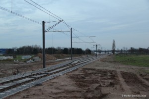 Die neue Endhaltestelle sieht mittlerweile weitgehend fertig aus. Eigentlich fehlt nur noch die Bahnsteigmöblierung. Ach ja - ein Zugang zur Haltestelle wäre auch noch nicht schlecht ... |