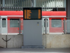 Der neue ZOB in Hennef. Er besitzt Info-Tafeln, ist barrierefrei und die Überdachung wird bei Nacht von LEDs beleuchtet. Diese LEDs können in sämtlichen Farben leuchten. |