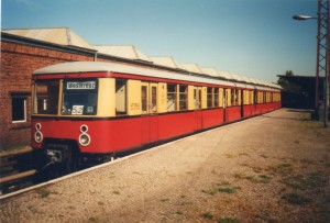 477 in BVG-Lackierung im Jahre 2000 in Strausberg. Nach der Wiedervereinigung wurden die 1984 von der BVG im Westen eingeführten Farbmodifizierungen für das wiedervereinigte gesamte Berlin übernommen und die nach 1984 im Osten verbliebenen Züge ebenfalls in Rubinrot RAL 3003 und Sandgelb RAL 1002 umlackiert. |