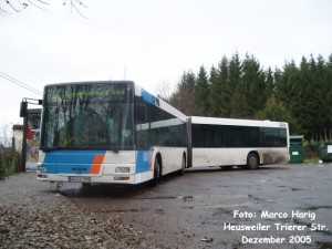 Zu sehen ist der Wagen 302, der als einziger seiner Serie eine orangefarbene Matrix erhalten hat. Aufgenommen am 10.12.2005 am REAL in Saarbrücken auf der Linie 47 |