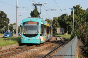 Vor der Kulisse des Fernsehturms kommt Wagen 5636 als "Betriebsfahrt" beschildert angefahren, um an der Haltestelle Universitätsklinikum als Linie 4 Richtung Oggersheim zu fahen. |