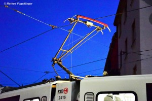 auf Testfahrt mit beleuchtetem Stromabnehmer. |