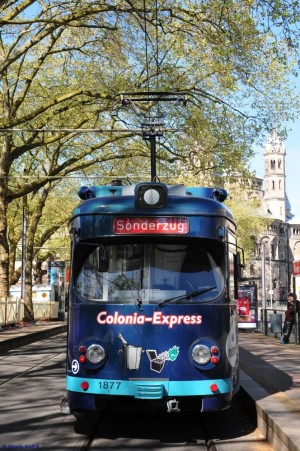 am 05.05.2016 war der 1877 anlässich einer Vatertags-Sonderfahrt unterwegs durch Köln. Hier an der Universitätsstraße als Ausrücker vom Btf West in Richtung Neumarkt unterwegs. |