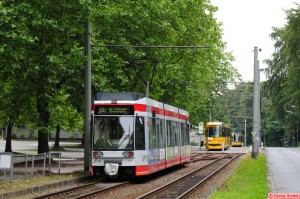 an der Haltestelle VELTINS Arena, welche ueber 4 Bahnsteiggleise und eine Wendeanlage mit drei Abstellgleisen verfuegt.