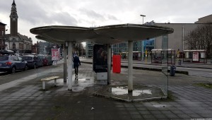 Die Zwischenebene der Haltestelle. Hier stehen ein paar abstrakte Formen als Skulpturen herum - sehen kann man sie leider nicht, weil die TEC im ganzen Raum diese Zäune platziert hat, die einen wie in einem Schlauch zum Bahnsteig führen. Der Grund dafür ist mir nicht bekannt, Bautätigkeiten habe ich keine gesehen. Hinten im Bild kann man den geschlossenen Ausgang zum Boulevard Solvay sehen, den ich schon von oben gezeigt habe. |