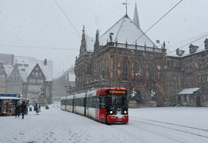 Die 6E hatten wir ja neulich schonmal, diesmal ein Bild an der Domsheide. Der Zug kommt aus Richtung Viertel (hinten rechts) und fährt in die Neustadt (vorne rechts). Das gibt es planmäßig nur ganz selten.